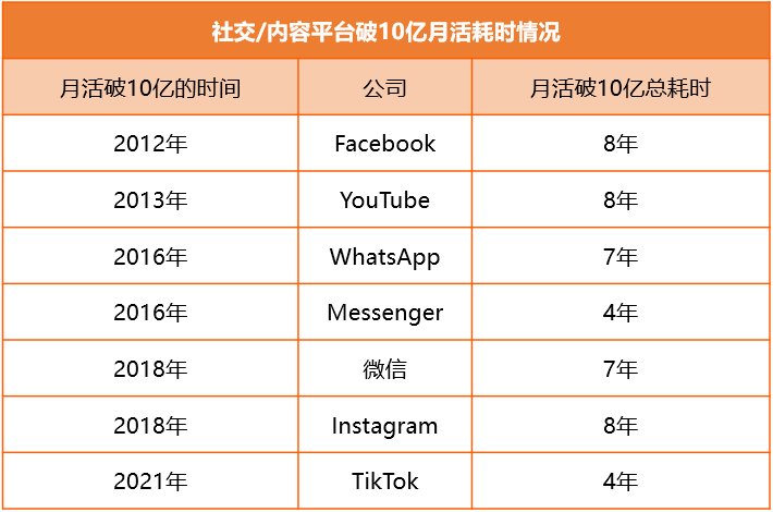由以下表格数据我们可以看到,TikTok仅用4年时间,在2021年月活就突破了10亿,比起其他多数平台突破迅猛。