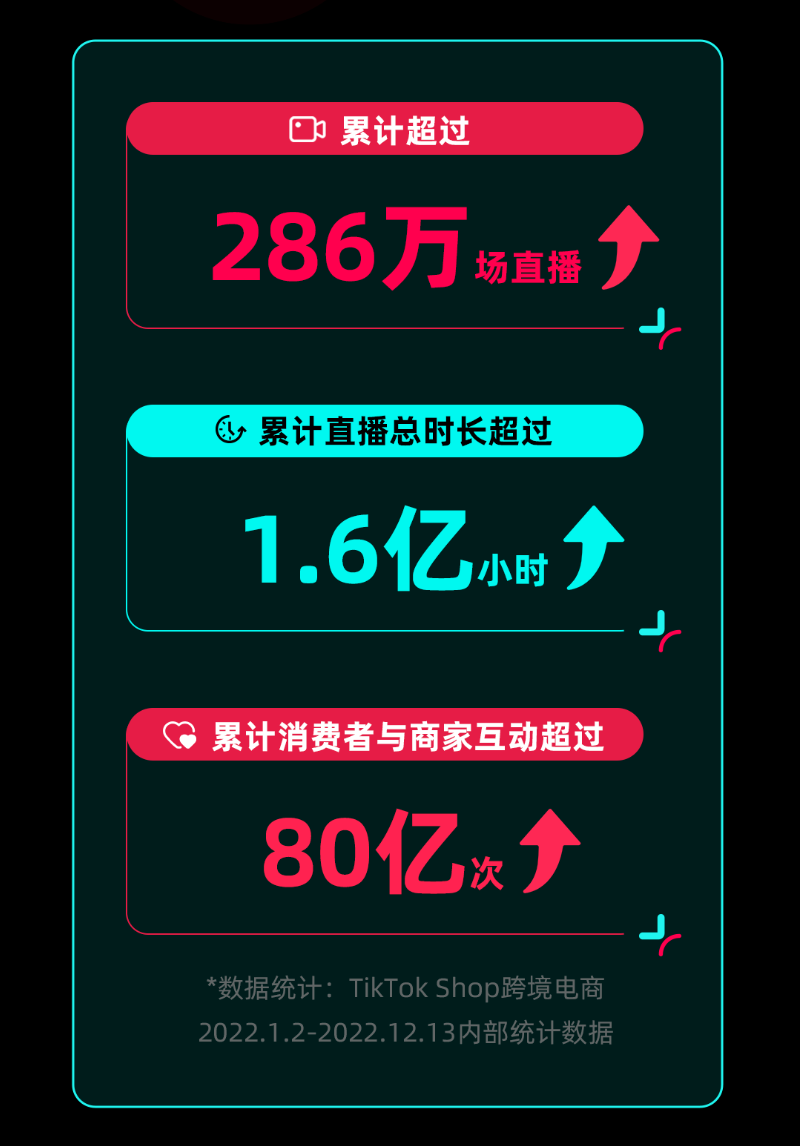 由TikTok Shop跨境电商官方账号发布的2022年度数据显示,TikTok Shop跨境电商2022年累计直播超过286万场,累计直播总时长超过1.6亿小时,消费者与商家累计互动超过80亿次。2022年1月2日-2022年12月13日,66%的用户觉得TikTok帮助其做出购买决策。67%的用户觉得TikTok促使其产生了新的购买决策。产生GMV转化的跨境电商短视频共超过243万条。